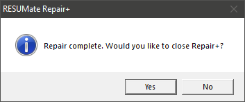 Click "Yes" to close Repair+. You and everyone else on your network can now open and use RESUMate normally.