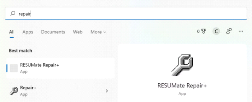 Unlike Compact & Repair, which is built into RESUMate itself, Repair+ is a separate program. Click your Windows start button or type the word "Repair" into your Windows search bar and you should see "RESUMate Repair+" as an app.