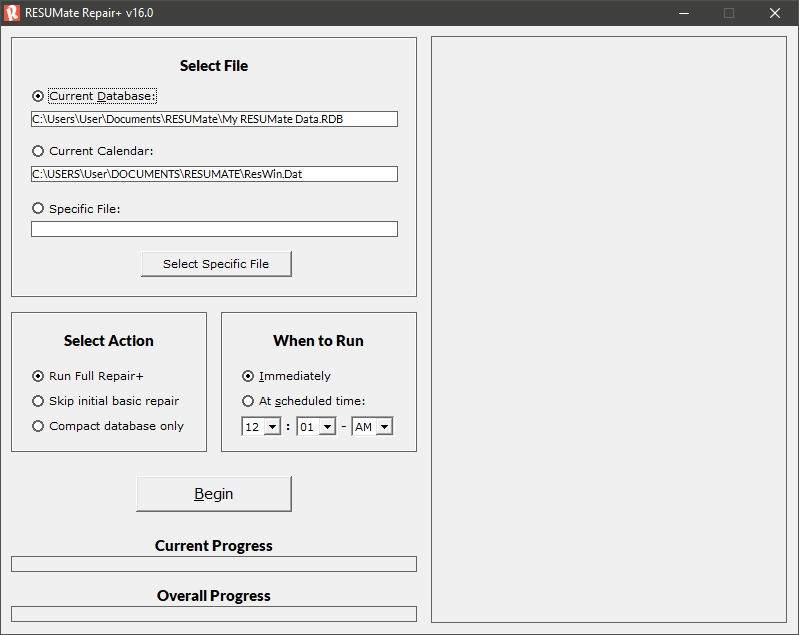 In the "Select File" section, your main .rdb database file should be automatically selected as the "Current Database" file. If it isn't, you can select your database file manually by clicking the "Select Specific File" button. Once the file to be repaired has been selected, click the "Begin" button and Repair+ will start. Repair+ can also be used on the RESUMate calendar file by following the directions above but selecting "Current Calendar" file or browsing for a different calendar file ("reswin.dat") with the "Other file" option.